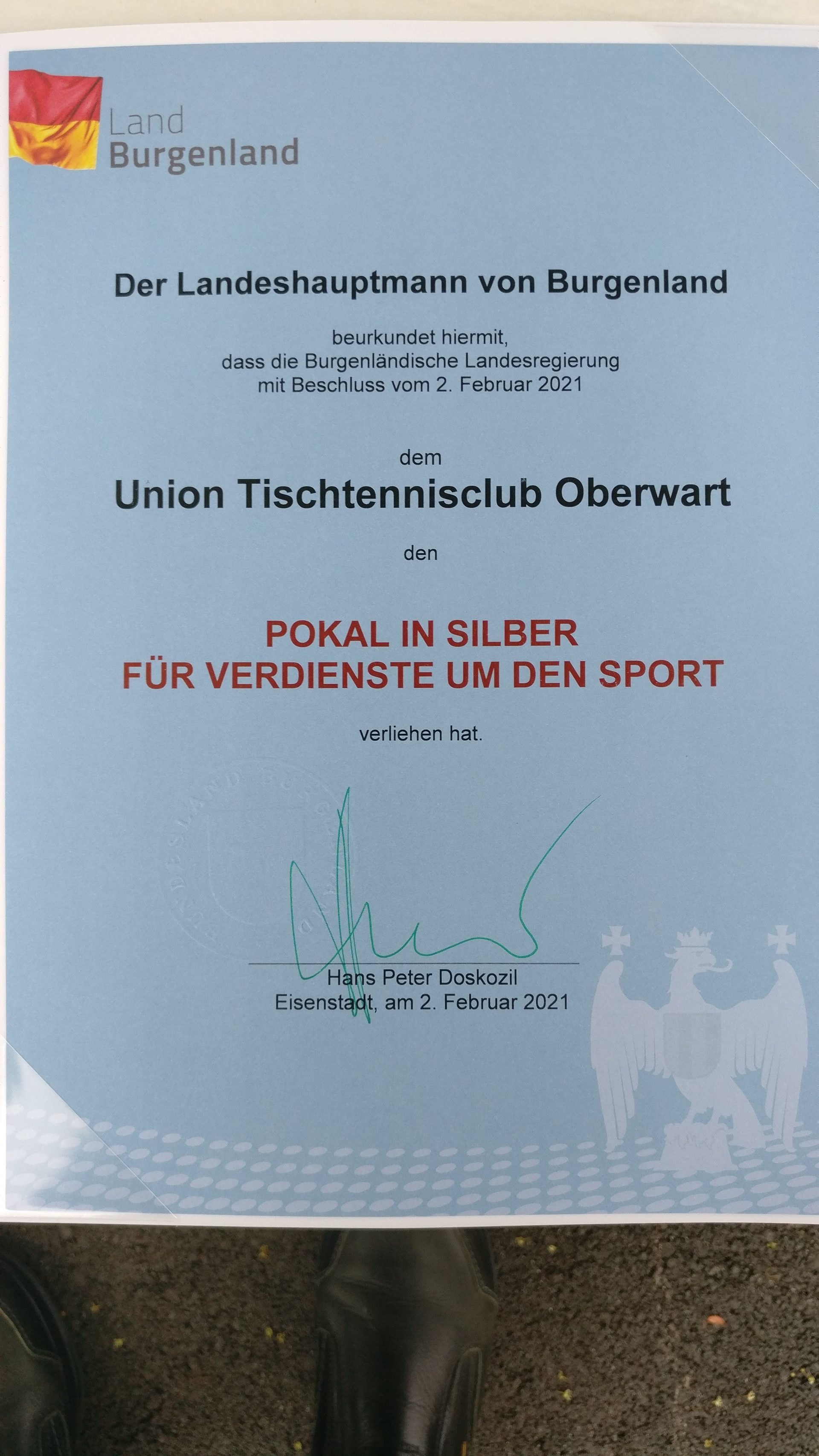 Der UTTC Oberwart hat für den Österreichischen Staatsmeistertitel im Herren Doppel, mit Dominik Habesohn und Mathias Habesohn, das Landessportehrenzeichen in Silber für Verdienste um den Sport im Burgenland, aus den Händen von Landeshauptmann Hans Peter Doskozil und Landesrat Heinrich Dorner, verliehen erhalten!